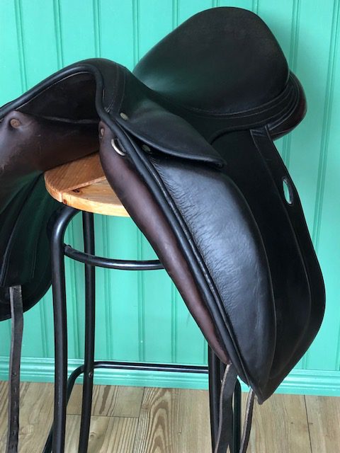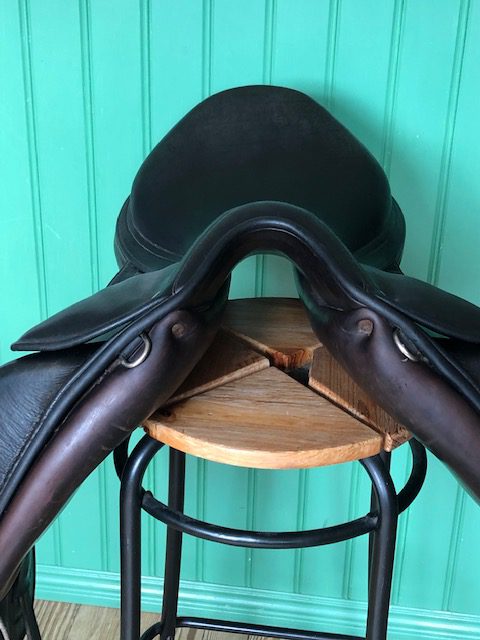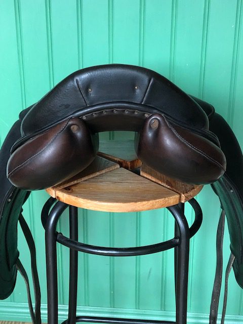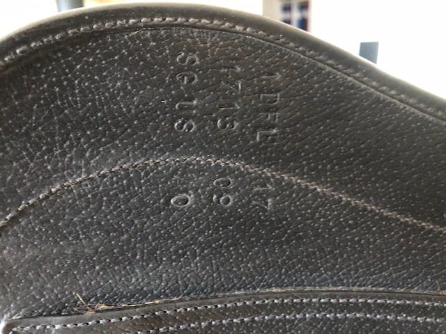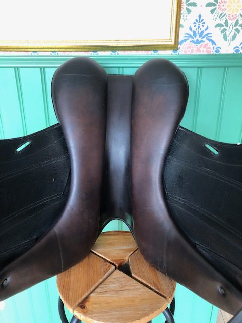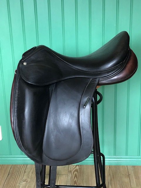 En fin och välskött Childeric DFL dressyrsadel. Halvdjupt säte och stora knästöd. Mycket rymlig kanal. Ganska platta bossor.